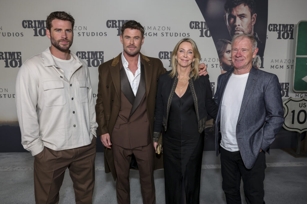 Liam Hemsworth, Chris Hemsworth, Leonie Hemsworth, and Craig Hemsworth attend the Amazon MGM Crime 101 World Premiere on February 10, 2026 at The United Theater in Los Angeles.